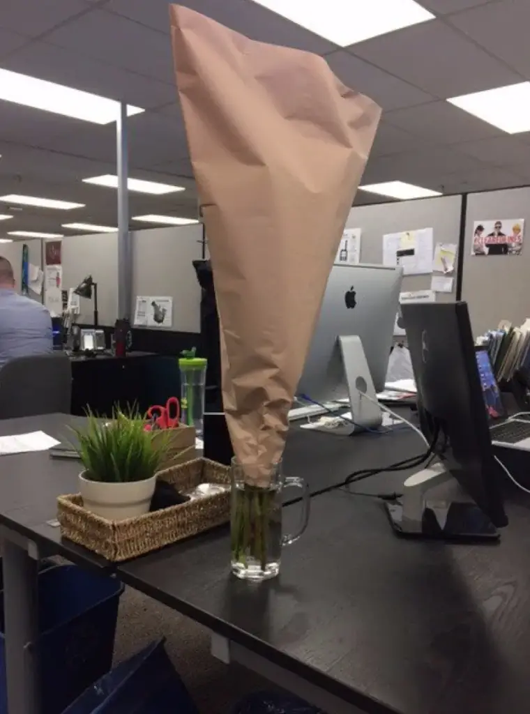 And here, the men in the office used their trust Teldio beer mugs for their Valentine’s Day flowers. That’s definitely one way to keep those flowers fresh for the afternoon! We approve!