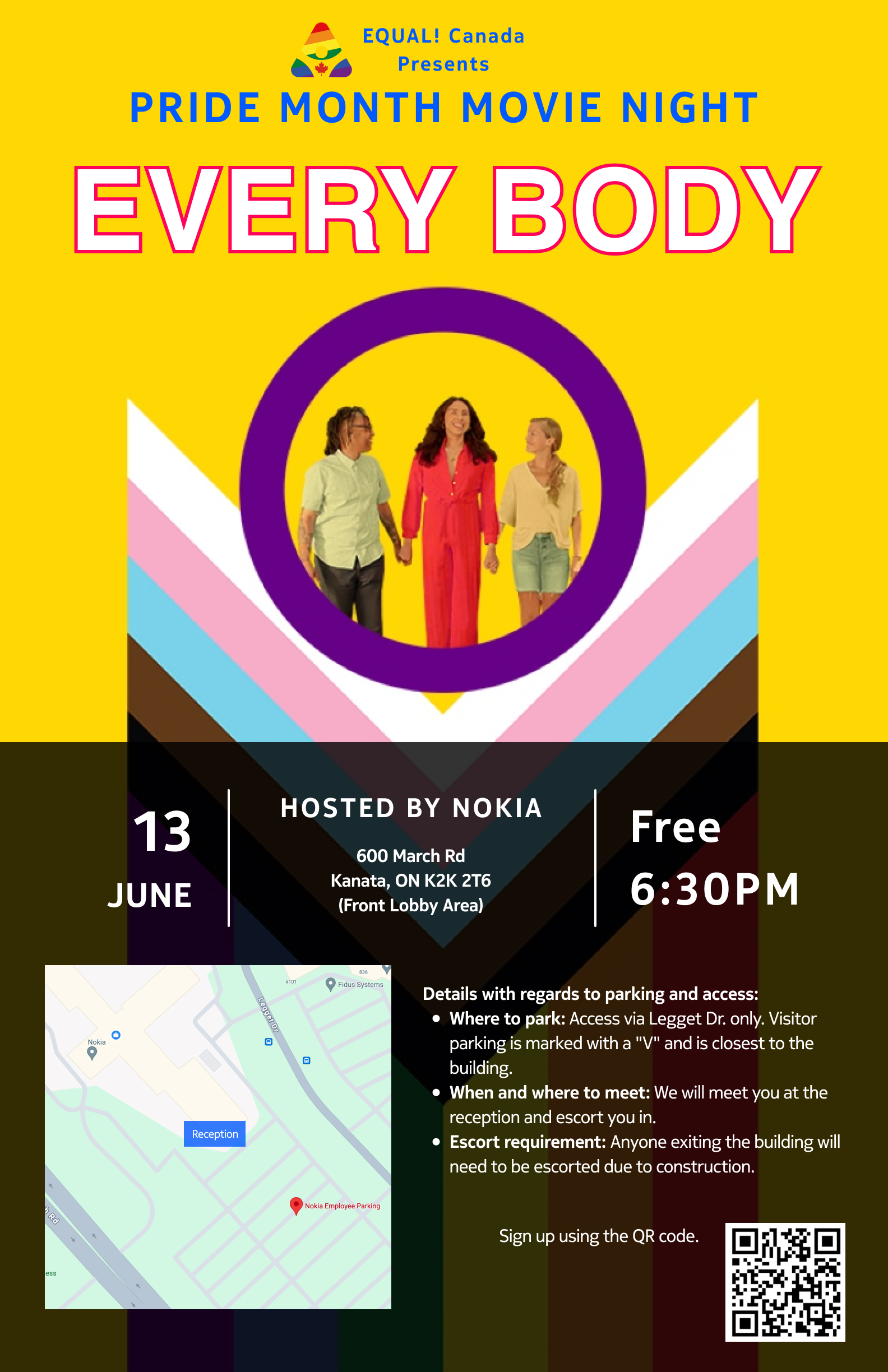 EQUAL! Canada at Nokia is excited to invite you to a special evening of cinema and community at our 2024 Pride Month Movie Night where we will be screening the award-winning film Every Body (2023). This invitation is open to all Nokians as well as members of the public and we encourage you to bring friends and loved ones.
