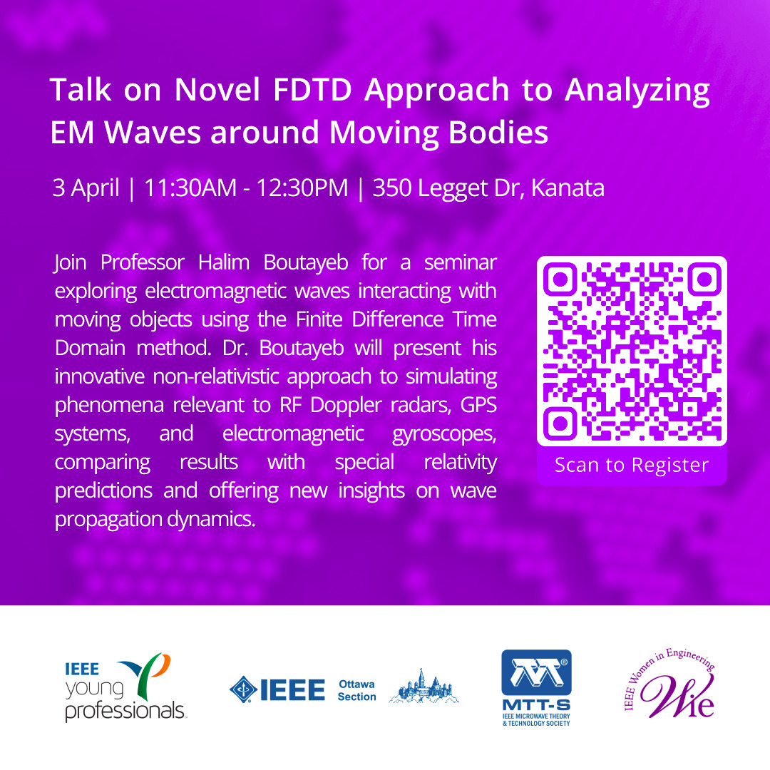 The analysis of electromagnetic problems with moving objects has many applications: RF Doppler radars, astrophysics, GPS, electromagnetic gyroscopes… This seminar proposes an original and thorough analysis of the behavior of electromagnetic waves in the presence of moving bodies by using the Finite Difference Time Domain (FDTD) method. Movements are implemented by changing positions of the objects at each time step, through the classical FDTD time loop. With this direct approach, time is implicitly absolute and Voigt-Lorentz transformations are not implemented. This technique is suitable for non-relativistic speeds, thus for most encountered electromagnetic problems, especially in antennas and propagation domain. The numerical aspects that need to be considered are studied. Then, different problems are investigated: moving plane wave source with resistors, moving observation point, moving inclined Partially Reflecting Surface (PRS), moving line source, and moving metallic cylinder illuminated by a plane wave. The results, in terms of Doppler frequency shift and changes in amplitude of the electric field, are compared with those of special relativity which are considered as the references. Some aspects of special relativity are present in the direct FDTD approach, such as the independence of the velocity of electromagnetic wave propagation with the speed of the source and Lorentz local time (with a different physical interpretation). Some of the obtained results agree with special relativity. Other ones are different, but the differences are negligible for non-relativistic speeds. Techniques are proposed for the implementation of relativistic effects. The results obtained with our analysis bring new physical insights on the propagation of waves with moving bodies. In particular, it is shown that the amplitude of the electric field for an ideal plane wave source does not increase with the speed of motion. Moreover, for a moving scattering metallic wire, one can observe a phenomenon similar to shock waves. Other analyzed problems include complexes motions (multiple speeds, acceleration, rotation, oscillation), moving airplanes, Michelson-Morley interferometer, Sagnac effect, Heaviside faster-than-light analysis. Some quantum phenomena (Compton experiment, blackbody radiation) are also studied… |