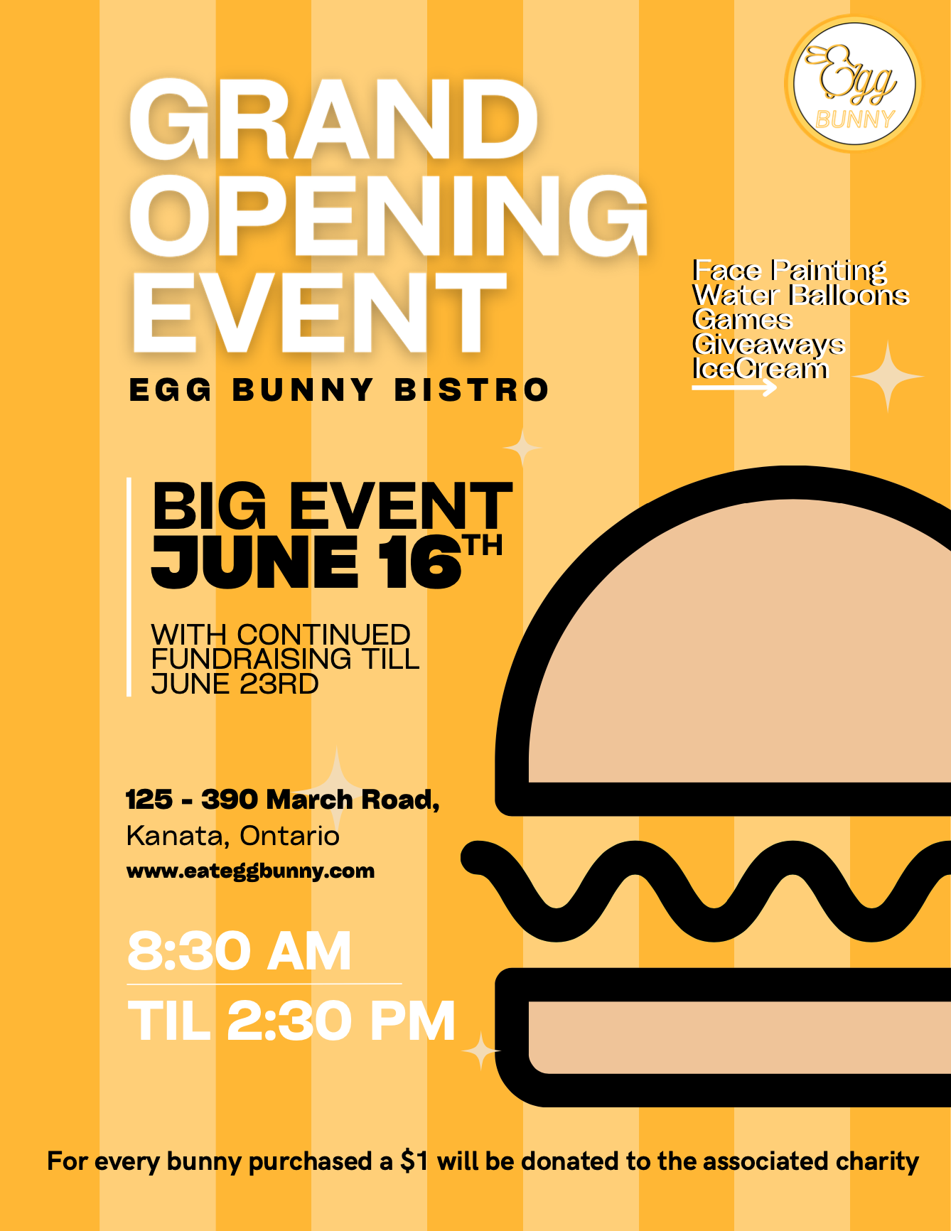 As of June 16th Egg Bunny Bistro will be launching with a large Father’s Day kickoff event, where every item purchased will be donated to a community organization in Kanata!