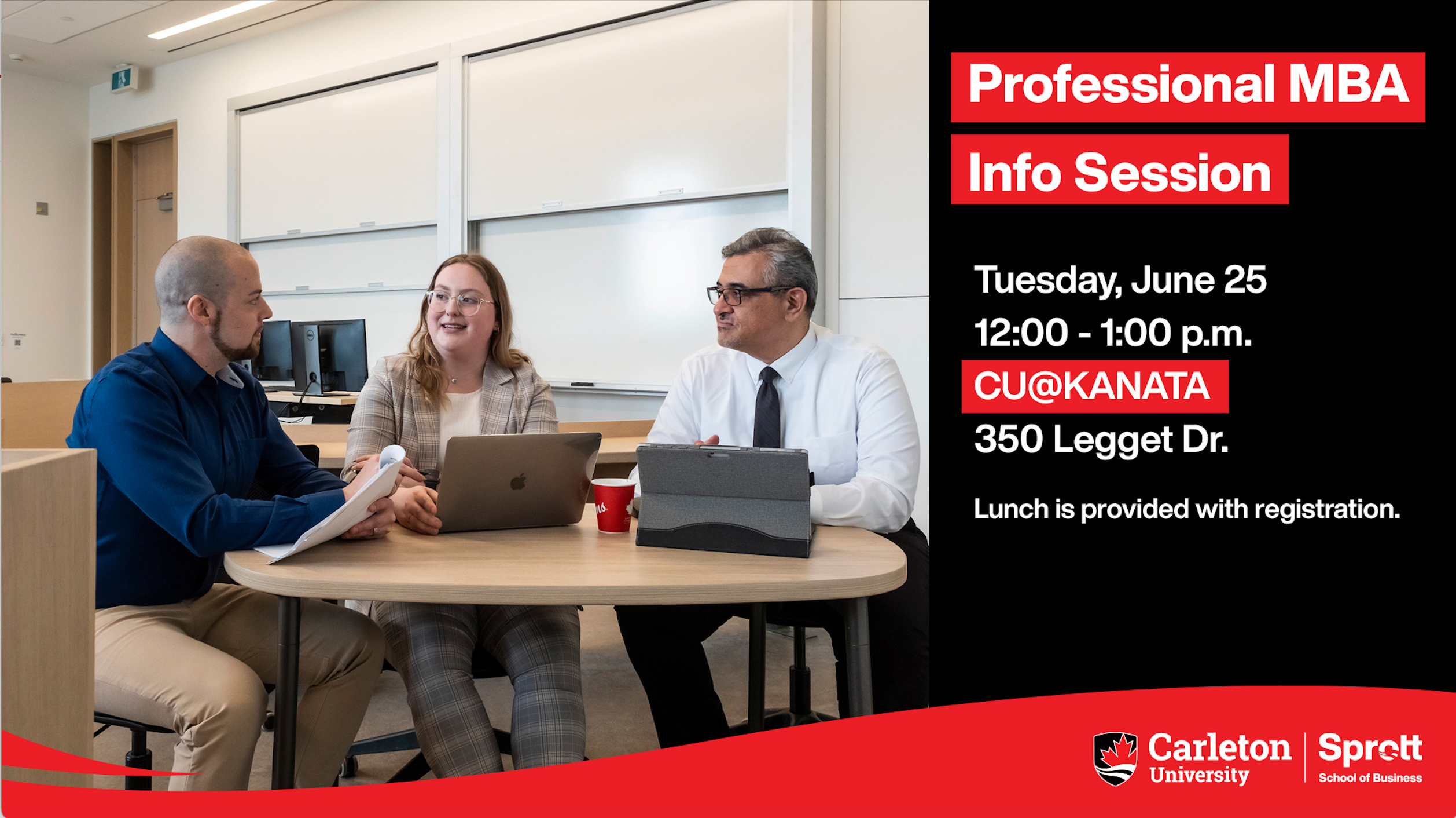 Those who would like to begin the process of advancing their career by learning more about Sprott’s Professional MBA program are invited to join our next in-person information session at CU@Kanata, 350 Legget Drive on Tuesday, June 25th from 12:00-1:00 p.m.