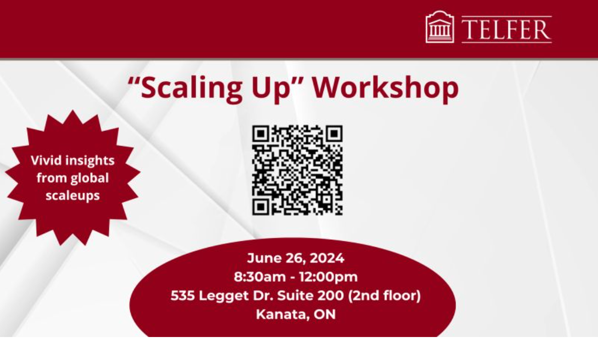 Hosted by the Telfer School of Management at the University of Ottawa our “Scaling Up” session is at uOttawa Kanata North campus (535 Legget), on the morning of June 26th. Details & registration via QR code above, or this LINK – Only 24 seats available, grab your spot now!