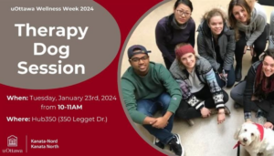 As part of the University of Ottawa Wellness Week 2024, the uOttawa Kanata North team is pleased to be hosting a therapy dog session at 10-11am for our Kanata North community on January 23rd. Come take a small morning break and make some new furry friends!