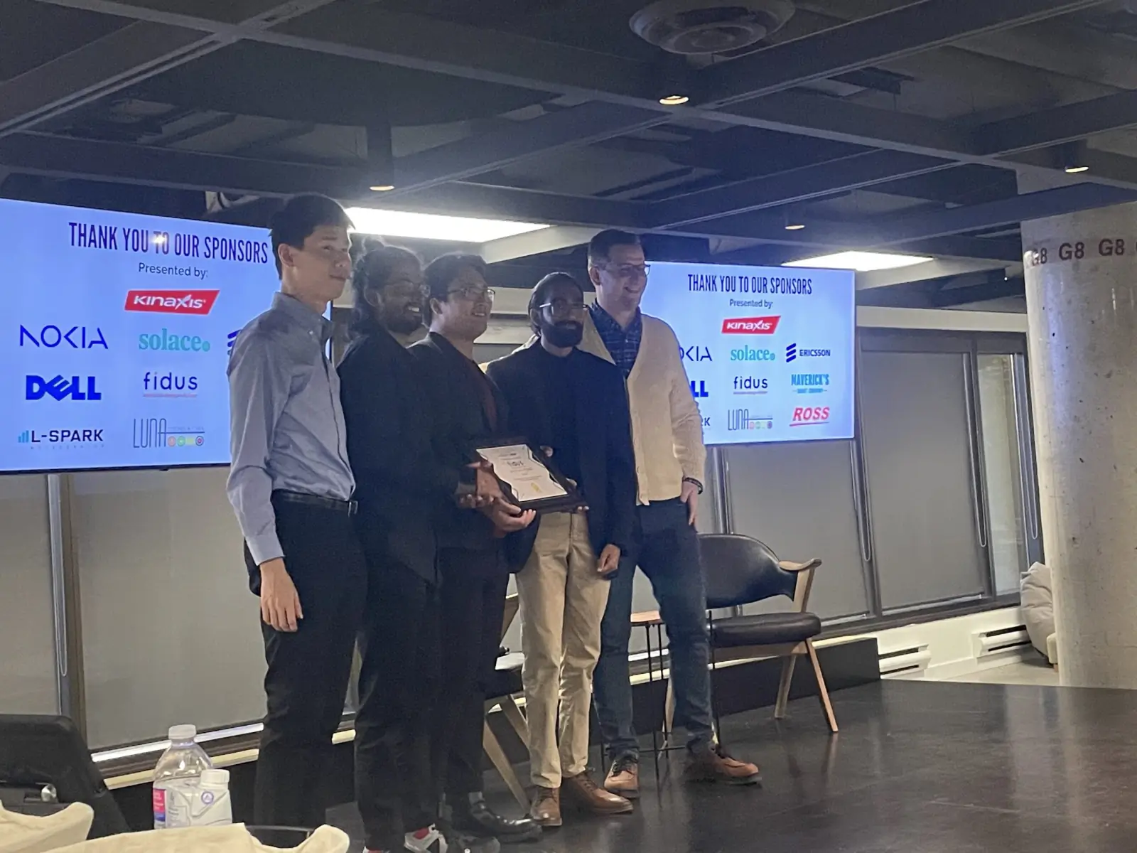 Third place team GreenSense won a $500 cash prize donated by Fidus Systems presented by Kyry Kryvorucko. The team members, Dominador Ibanez, Karthikeya Saligram, Kelvin Ling, and Neel Patel, boldly began their presentation with “you’ve heard the problems. Now here’s the solution.” It promised to use 5G and IoT to properly track emissions at data centres, making them more sustainable, providing metrics on how to reuse heat created from servers in data centres.