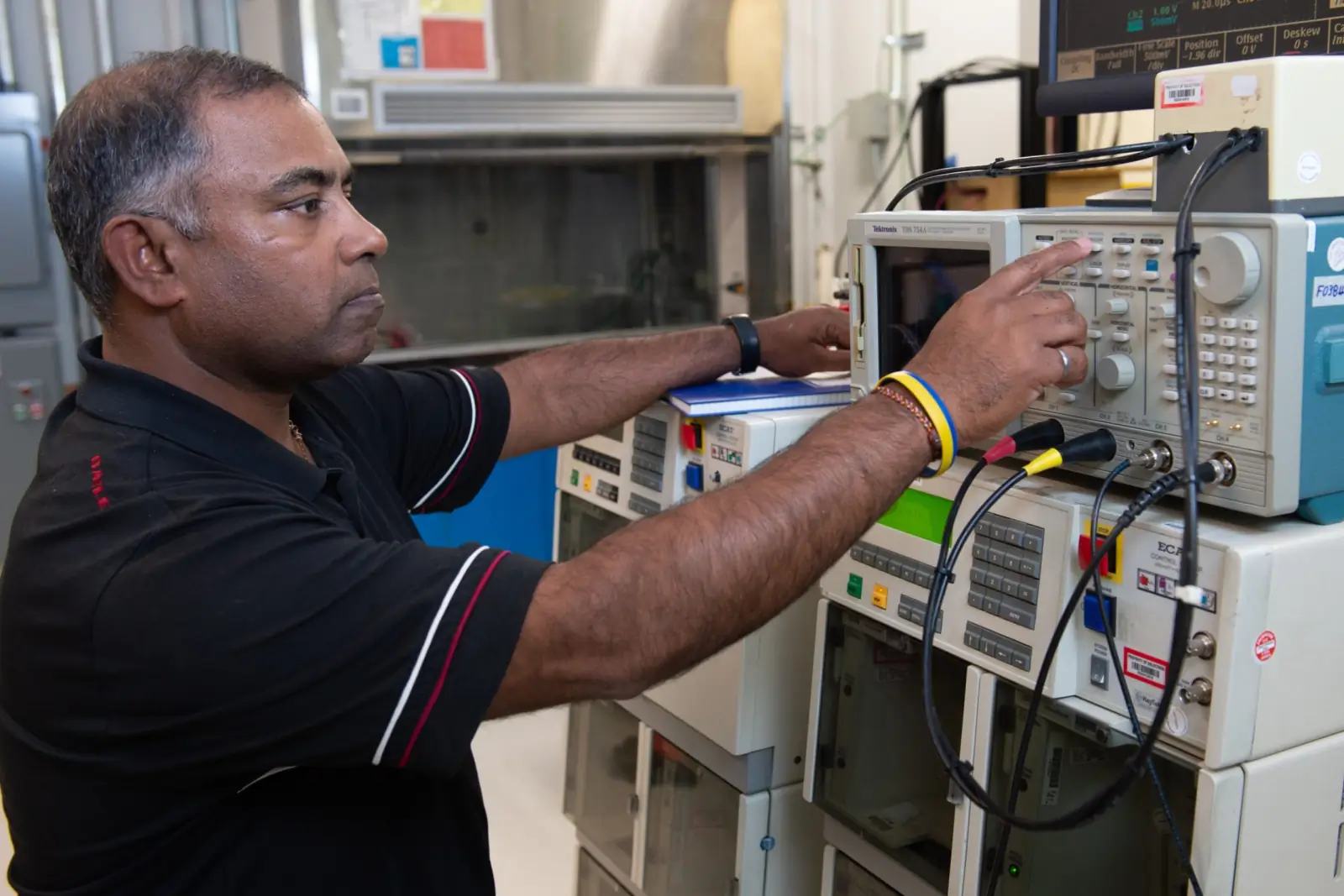 Power and safety engineer Suthan Kuhanesan uses a lightning surge generator during the safety certification process.